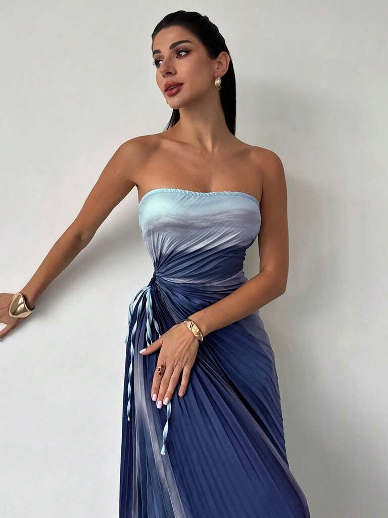 Vestido Lorena Plissado Longo Com Amarração Detalhe em Flor Rosa Bebê